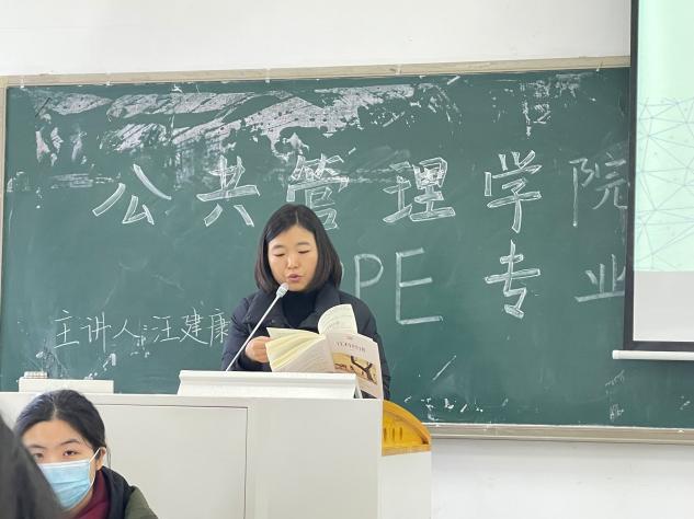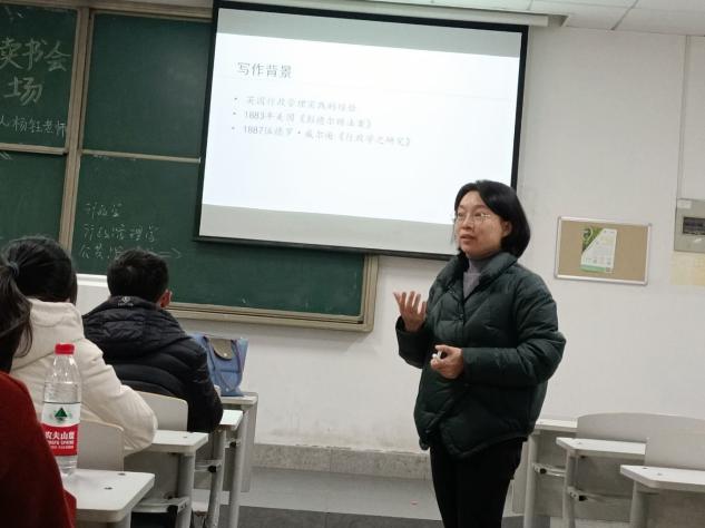 在竞秀南楼103教室,杨钰同行政管理专业的同学分享的书籍是美国作家弗兰克·古德诺的《政治与行政》。杨钰首先向同学们介绍了这本书的写作背景和主要内容,然后从国家的主要功能展开对政治和行政的分析,并与同学一起研究了行政体制对政党的影响。最后杨钰向同学们强调了本书中采用的对比的研究方法,并期望同学们在此后的阅读中能运用此方法。