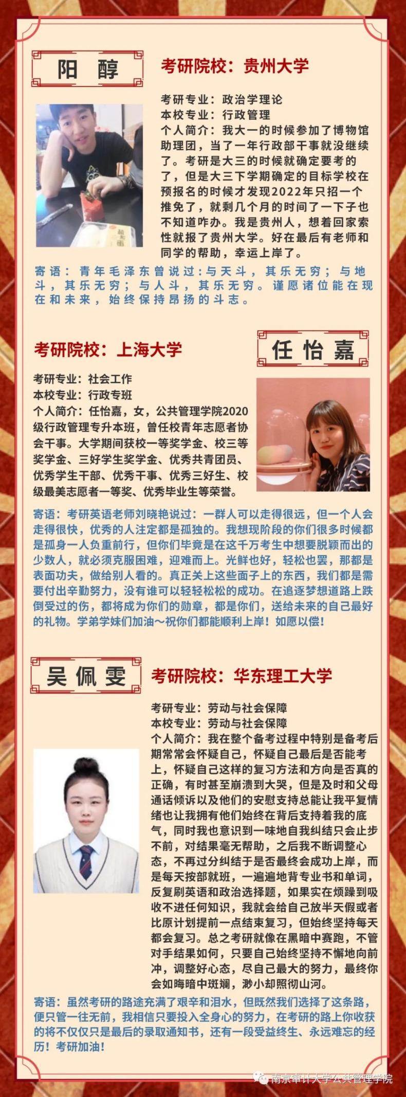 看到这里,大家是不是已经开始在心里默默羡慕学霸们的好成绩并且感叹他们的自律了呢?接下来让我们一起阅读考研上岸的学长姐的相关简介和对学弟学妹们的寄语,了解一下学霸的学习生活,从中获得更多考研备考经验。还在等什么,快来看看吧!