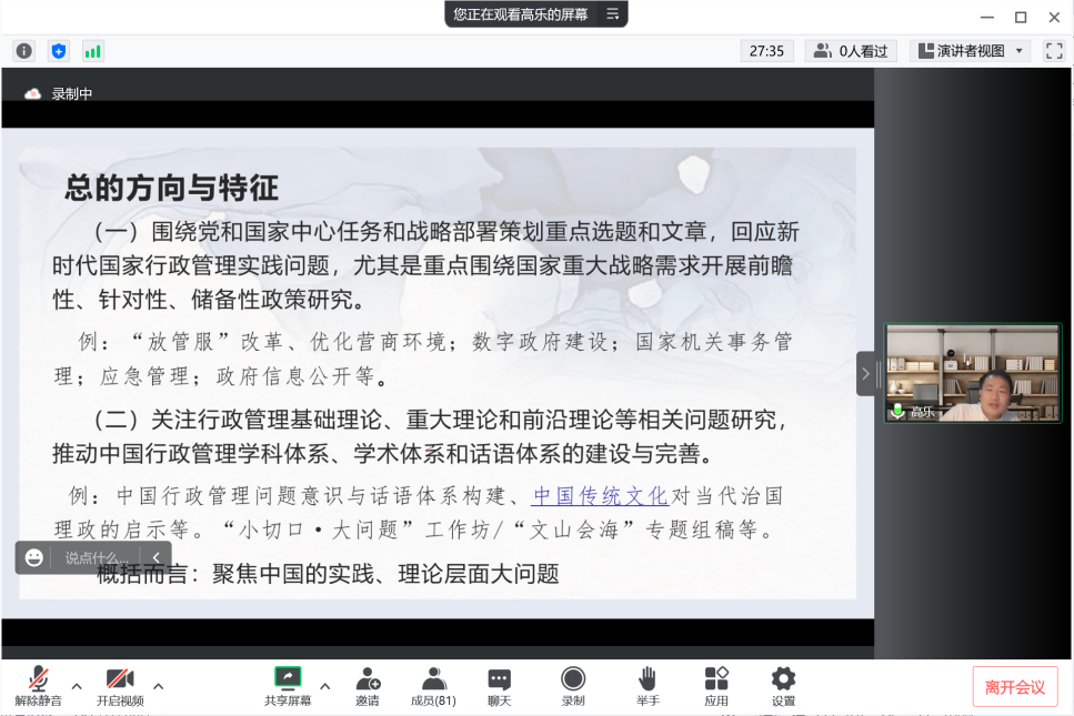 2022年9月28日晚,中国行政管理杂志社专职编辑、副编审、行政管理博士高乐给老澳门六合彩 学生带来了主题为“《中国行政管理》期待怎样的文章”的学术讲座。本次讲座依托腾讯会议平台展开,由老澳门六合彩 副院长赵军锋教授主持并点评。