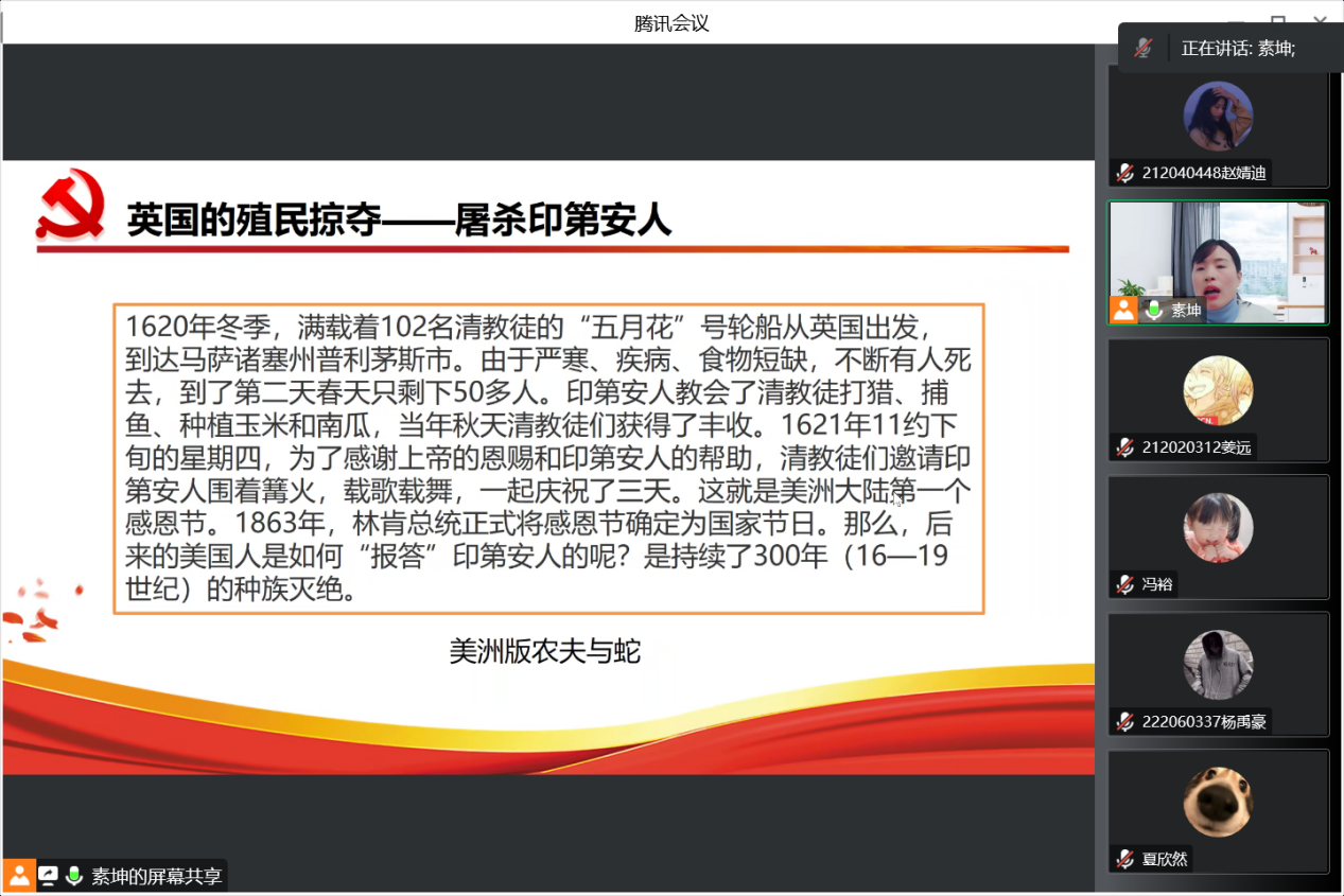 紧接着冯素坤老师向我们阐述了西方现代化和中国式现代化有何不同,西方现代化是随着资本主义发展实现工业化、城市化和西式民主化的过程,是通过海上霸权、工业霸权、金融霸权实现的。其中冯老师着重介绍了西方现代化海上霸权的阶段,她指出西方现代化过程充满了暴力与血腥。