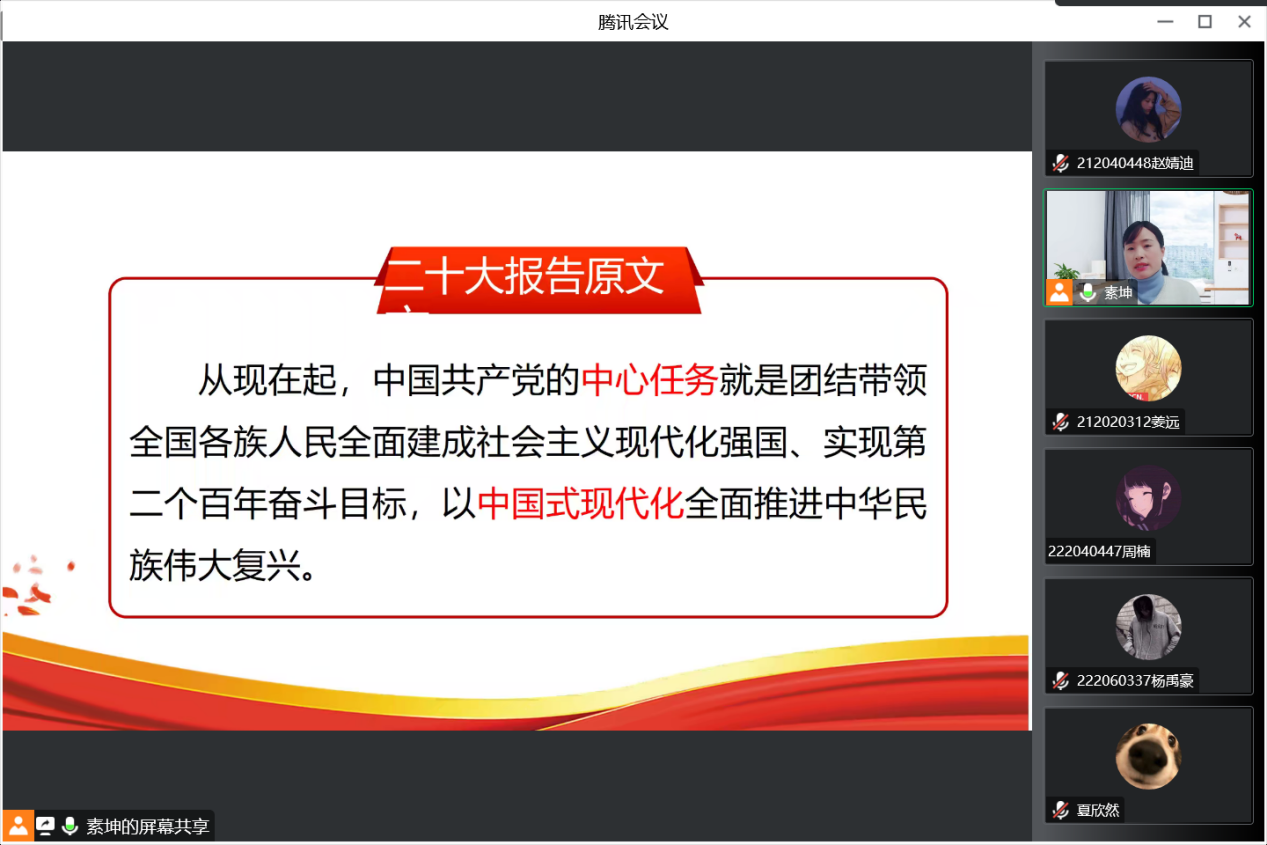 活动伊始,冯素坤老师从中共二十大报告引入,指出从现在起,中国共产党的中心任务是团结带领全国各族人民全面建成社会主义现代化强国,实现第二个百年奋斗目标,以中国式现代化全面推进中华民族伟大复兴。中国式现代化为人类实现现代化提供了新的选择,中国共产党和中国人民为解决人类面临的共同问题提供更多更好的中国智慧、中国方案、中国力量。