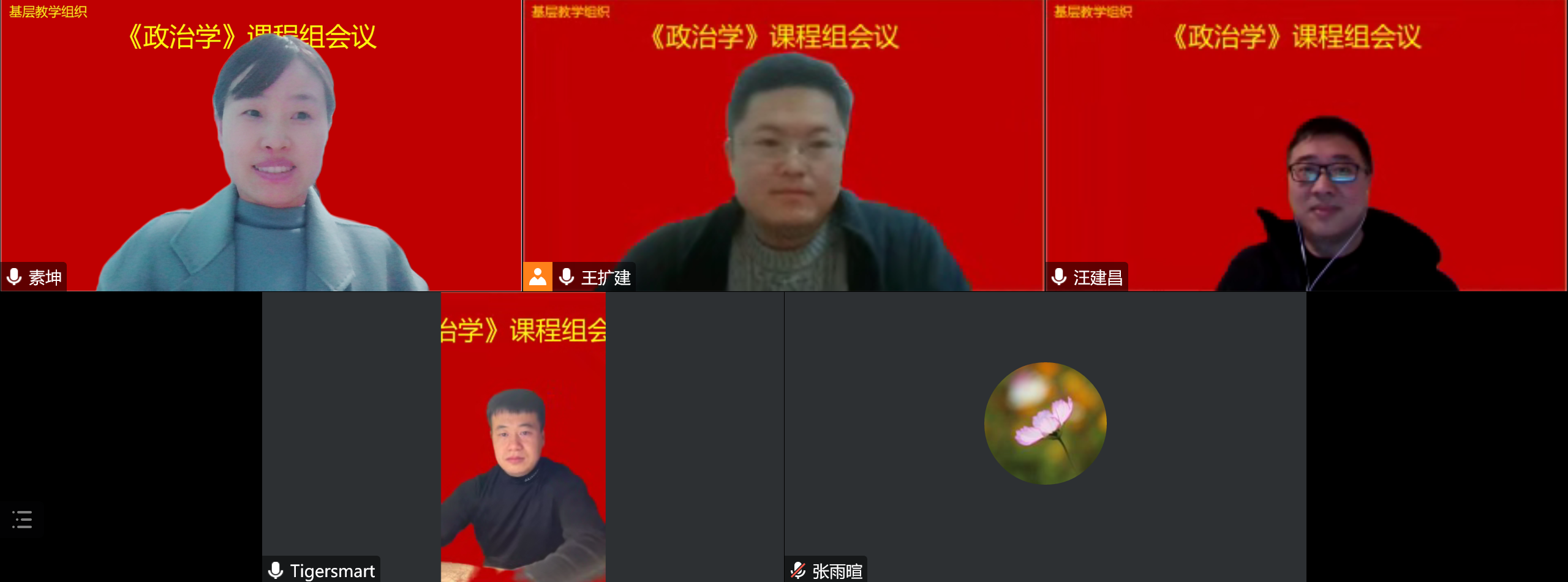 根据学校《关于开展教学大纲修订工作的通知》等文件精神,为更好发挥基层教学组织的作用,加强集体备课和教学研究,2022年12月7日晚,在金太军教授指导下,老澳门六合彩 《政治学》课程组教学研讨会在腾讯会议举行。课程组成员王扩建、姚虎、张雨暄和冯素坤等4位老师参加本次研讨,学院副院长汪建昌参与研讨,会议由王扩建主持。
