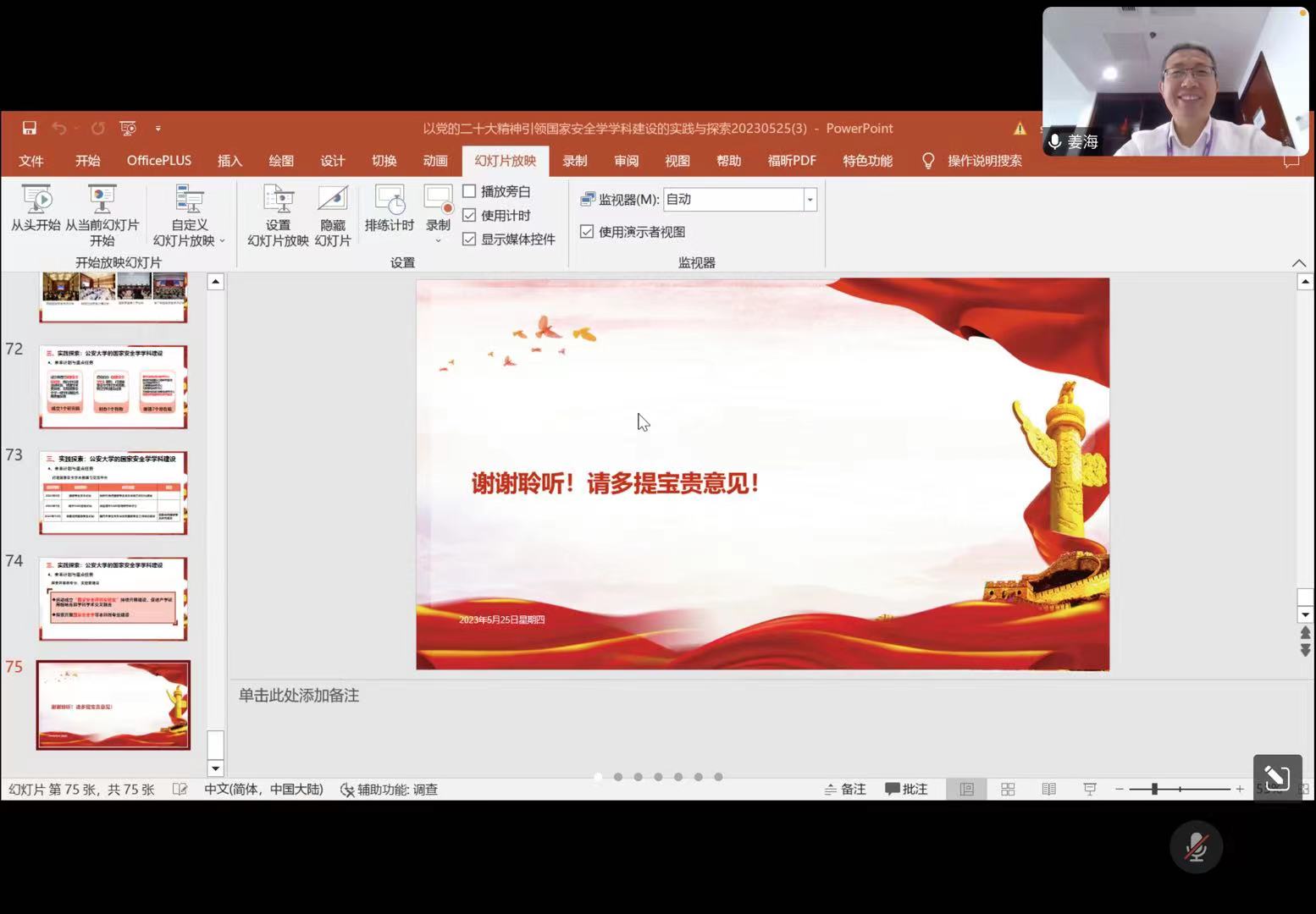 会议过程中,李教授主要从国家安全学学科建设的理论指引、建设现状与实践路径三个方面展开介绍。首先,李教授详细解读了新时代国家安全工作的方略谋划和实践创新、党的二十大报告对国家安全的专章阐释以及党的二十大精神对国家安全学学科建设的指引;其次,李教授对各高校国家安全学学科的总体情况、建设现状、招生情况以及问题瓶颈展开了深入分析;最后,李教授重点讲授了中国人民公安大学建设国家安全学学科的路径与思考,包括基础、思路、成效以及下一步的重点任务与计划方案等内容。互动环节,围绕国家安全学与公共管理的学科交叉与深度融合,学院领导、研究生代表与李教授做进行了积极的学术探讨与经验交流。