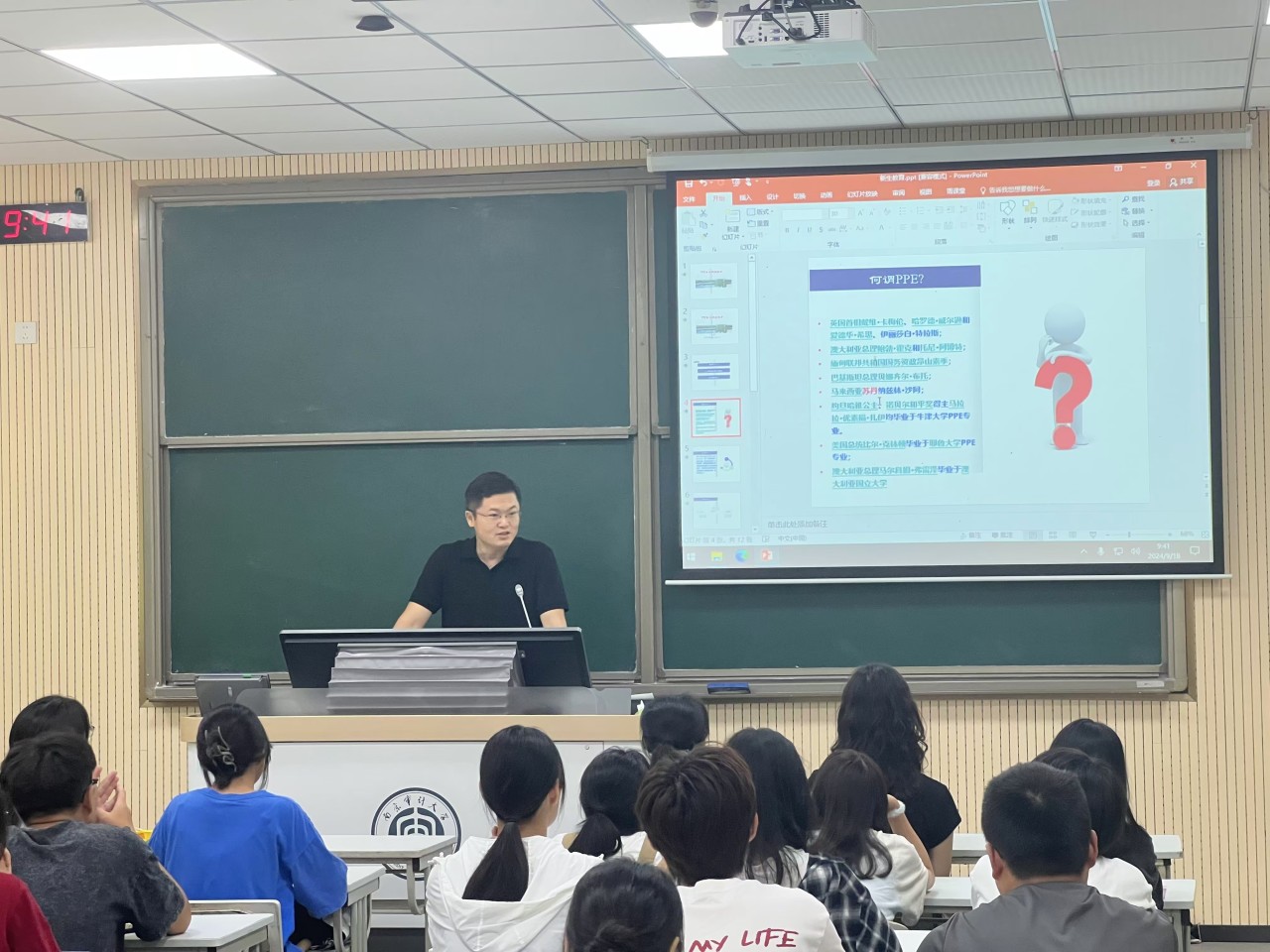林莉老师首先对2024级新同学的到来表示欢迎,并就未来4年学习,PPE同学毕业去向等给大家进行了交流。仲素梅老师从班级管理等方面进行了交流。王扩建老师从何谓PPE、人才培养方案解读及如何学习三个方面进行了分享。他指出要抱着清零心态和感恩之心,爱专业爱学校,并合理规划好自己的大学生活,为自己未来蓄力。